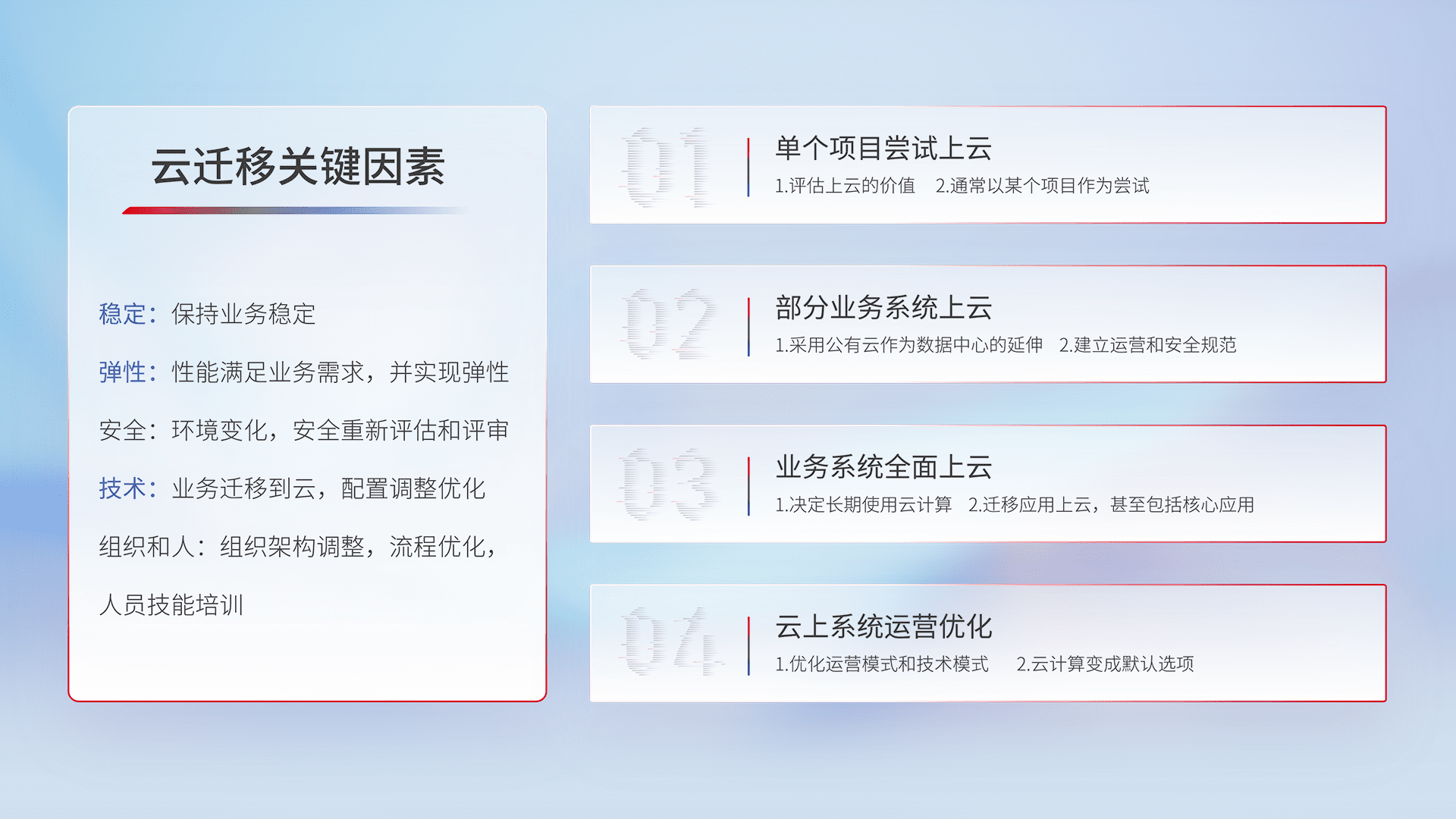 结合实际业务,,,从规划设计、、云平台选型、、云原生改造、、、、数据迁移、、集成交付,,,,迁移全过程为客户识别最佳上云路径,,做好风险识别管理,,,设计网络架构、、、身份权限、、、安全审计合规、、、操作审计、、日志审计、、、、监控告警策略、、、、多站点容灾设计等,,,,对云上基础设施进行整体规划,,,提升IT治理水平,,,以满足弹性、、高可用、、高性能的需求。。